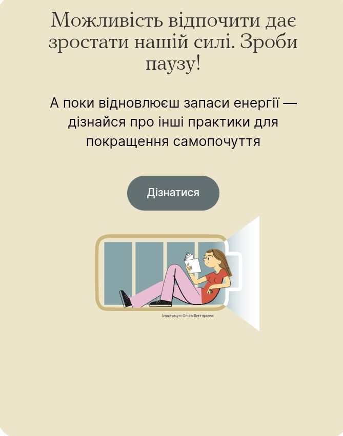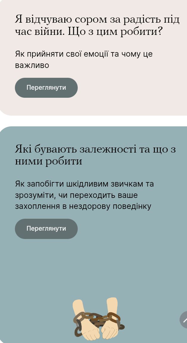 «Ти як?» https://howareu.com/. Тут зібрана уся необхідна інформація з доказовими техніками самодопомоги, верифікованими рекомендаціями від професіоналів, гарячими лініями і сервісами онлайн- та офлайн психологічної допомоги.
